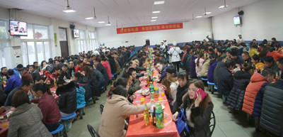 2月16日晚上,集團(tuán)公司南區(qū)、北區(qū)食堂里張燈結(jié)彩,拉滿喜慶橫幅,600多名外地留守員工沉浸在喜迎新春的歡樂氛圍中。公司正在為今年沒有回老家過春節(jié)的外地留守員工舉行“同吃年夜飯,歡度春節(jié)”活動(dòng)。