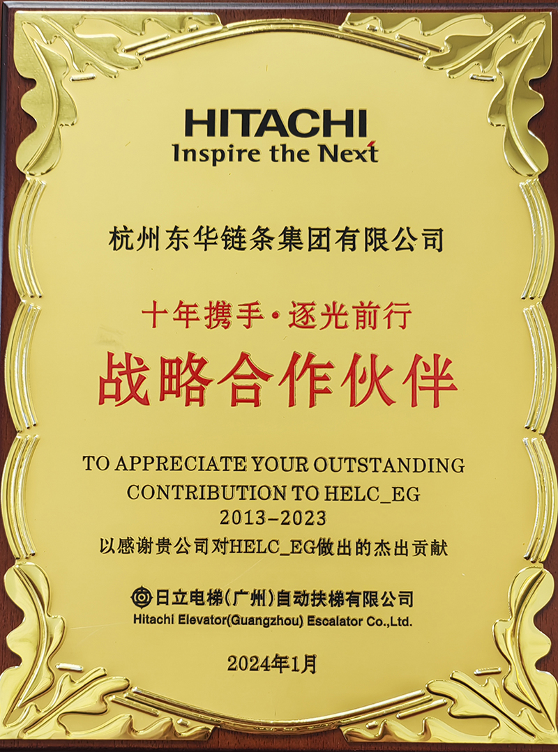 日立電梯(廣州)自動(dòng)扶梯有限公司是東華的重點(diǎn)配套主機(jī)客戶(hù),其配套產(chǎn)品涵蓋商用梯、公交梯,雙方在多年的合作中已建立了良好的合作基礎(chǔ)。2023年,扶梯工程鏈?zhǔn)聵I(yè)部積極實(shí)施細(xì)分市場(chǎng)冠軍戰(zhàn)略,堅(jiān)持專(zhuān)業(yè)化、系統(tǒng)化、高端化和高質(zhì)量發(fā)展的定位,不斷開(kāi)發(fā)和滿(mǎn)足日立電梯的需求,積極走訪(fǎng)市場(chǎng),在產(chǎn)品制造過(guò)程中嚴(yán)控工藝、提升交付率,在產(chǎn)品質(zhì)量上更是精益求精,全方位提升服務(wù)。此次東華獲得2023年度突出貢獻(xiàn)獎(jiǎng)和戰(zhàn)略合作伙伴獎(jiǎng)是日立電梯(廣州)自動(dòng)扶梯有限公司對(duì)東華扶梯鏈產(chǎn)品質(zhì)量的高度肯定,也讓我們對(duì)2024年服務(wù)好客戶(hù)信心倍增。