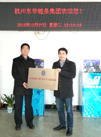 12月27日,杭州出入境檢驗(yàn)檢疫局檢驗(yàn)監(jiān)管處何處長與機(jī)械科科長一行赴東華集團(tuán),代表國家質(zhì)檢總局為我集團(tuán)授予“中國出口質(zhì)量安全示范企業(yè)”獎(jiǎng)牌。集團(tuán)副總經(jīng)理袁立華等高層參加了授牌儀式。